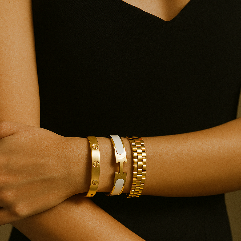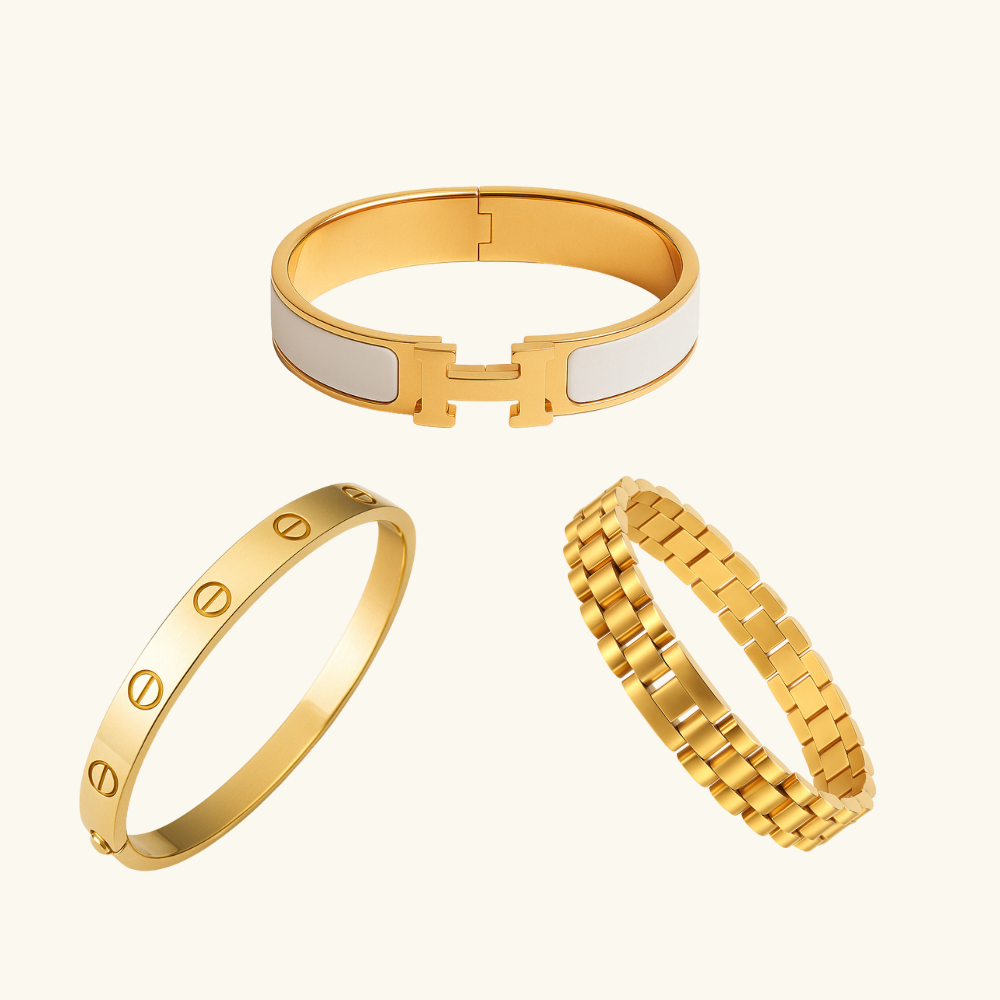 Een krachtige mix van design en klasse: de iconische H-armband met witte accenten voor een frisse, moderne look, de klassieke schroefarmband voor een vleugje tijdloze elegantie, en de robuuste schakelarmband die elke outfit direct versterkt. Deze set is gemaakt voor de vrouw die haar uitstraling moeiteloos wil laten spreken – chic bij elke gelegenheid.